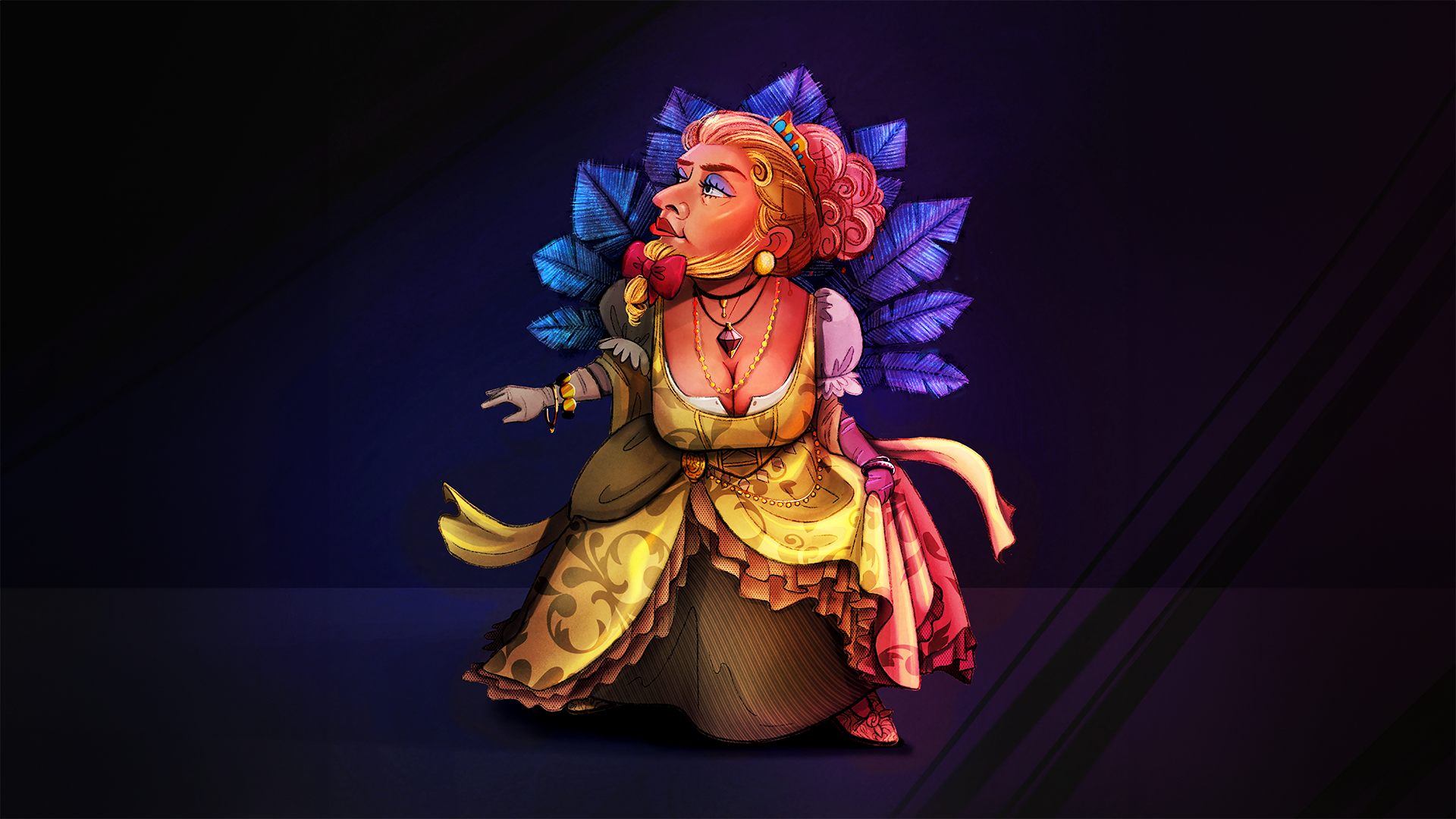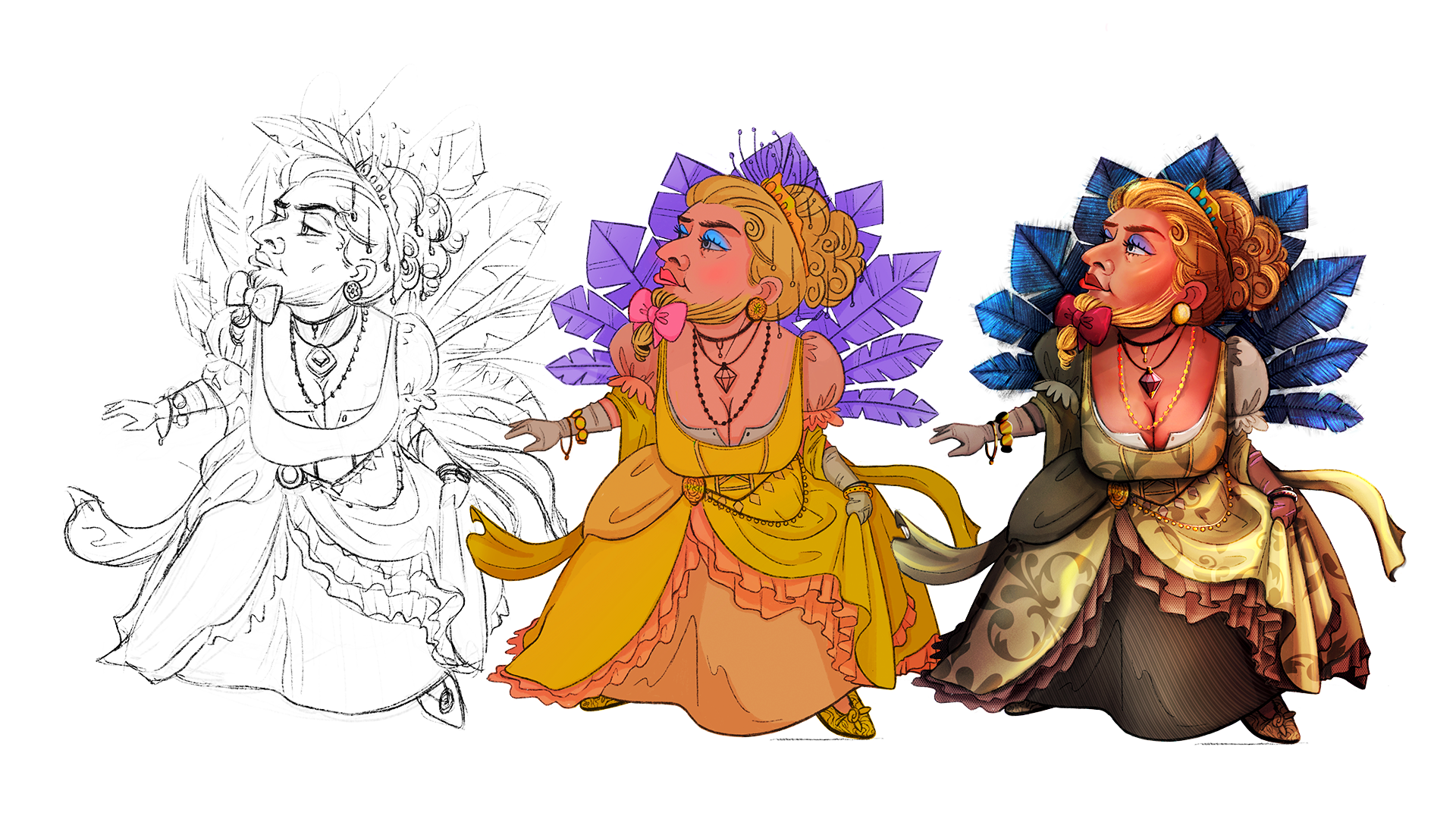 This work in progress contains 12 playable characters of a card game, divided into four creature types: Orcs, Elves, Humans, and Dwarves. Each character also represents a different music genre: Rock/Metal, Opera, or Rap. So far, only the Opera Dwarfesse has been colored, but all characters are sketched and ready for development.